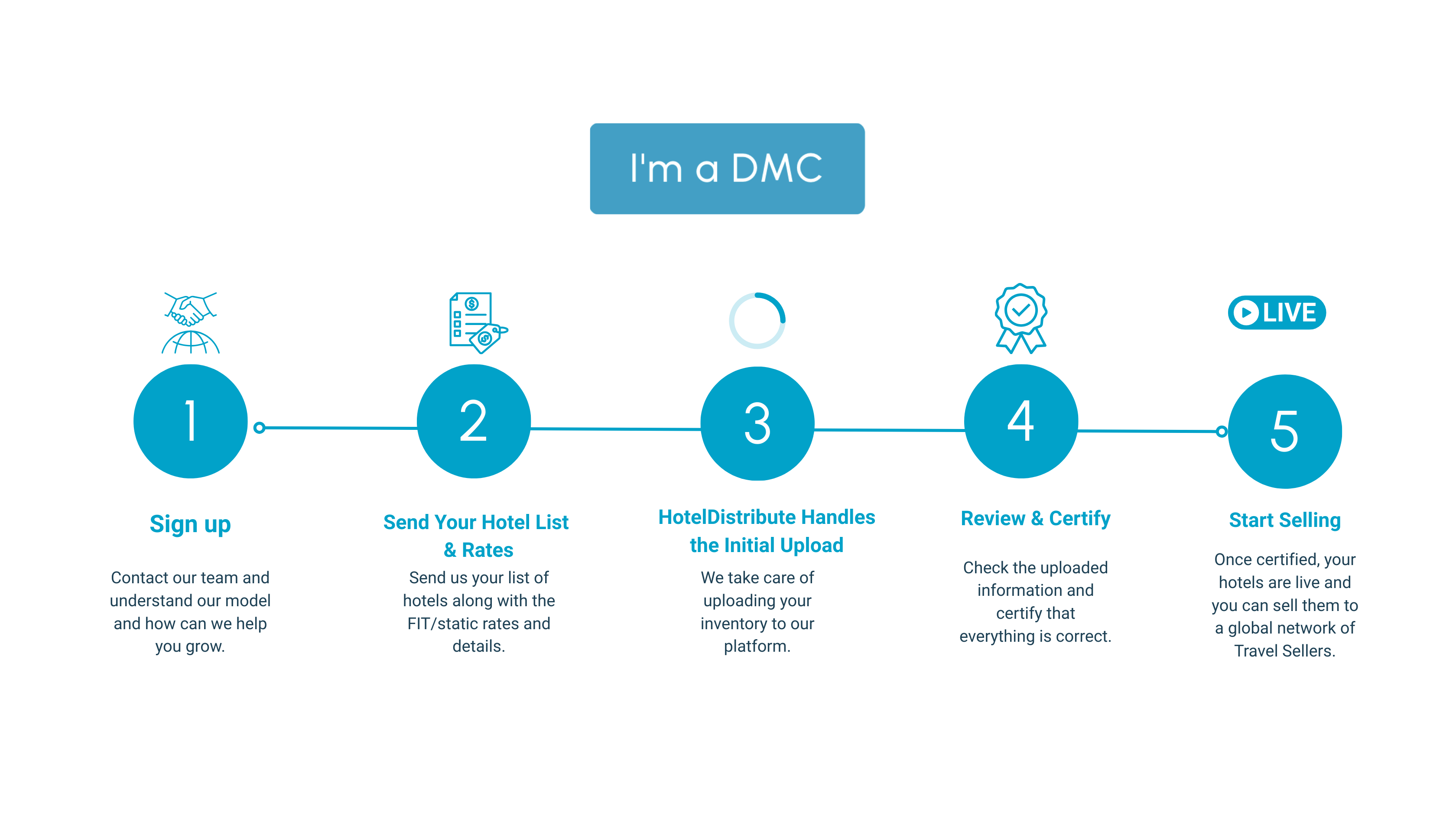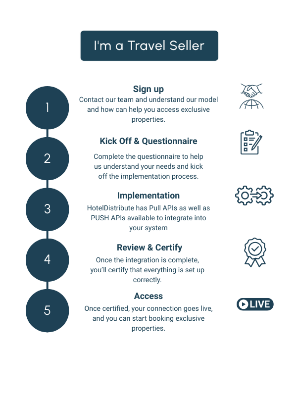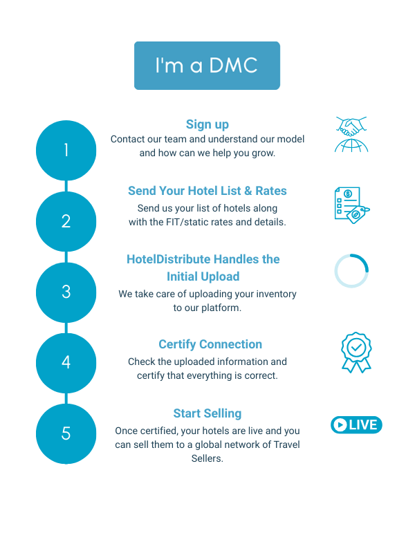 Using HotelDistribute, both DMCs and travel sellers instantly access a global network with no contracts or complex integrations. Simply activate or sign up, and start distributing or booking accommodations right away, all through our platform.